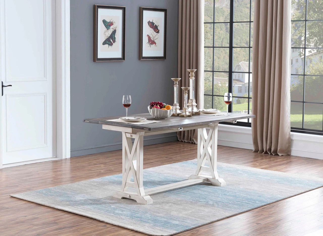 This console with stained wood finish top and creamy white finish bottom is a great piece for double use in the home. Use as console or sofa table and when extra dining is needed the top flips open to a nice 36″ x 64″ size for those extra party guests. The stylish base is casual yet elegant and will work with many decorating styles.
