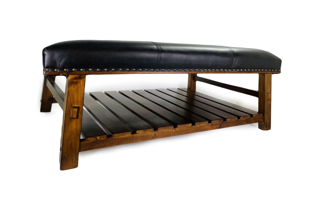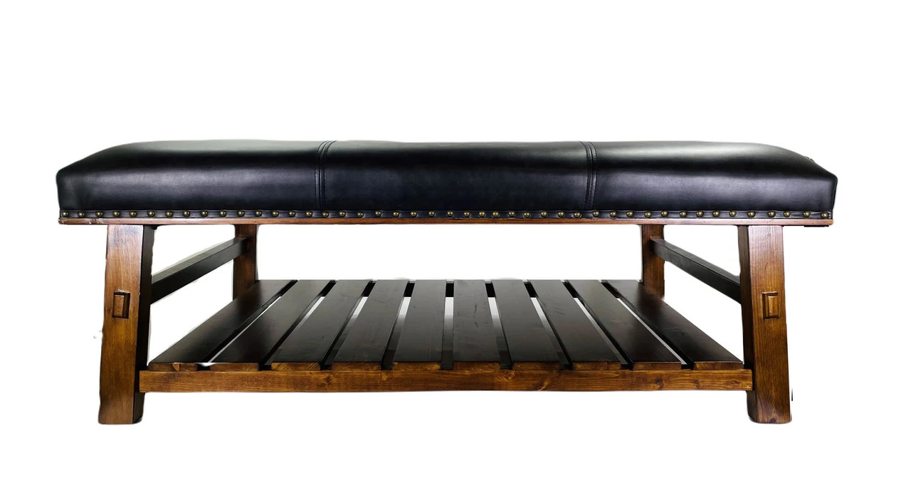 This Mission style bench has a rich medium brown stain with plank construction for excellent strength and durability. Saddle stitch detailing on faux leather top with antiqued brass nail head trim adds additional style.