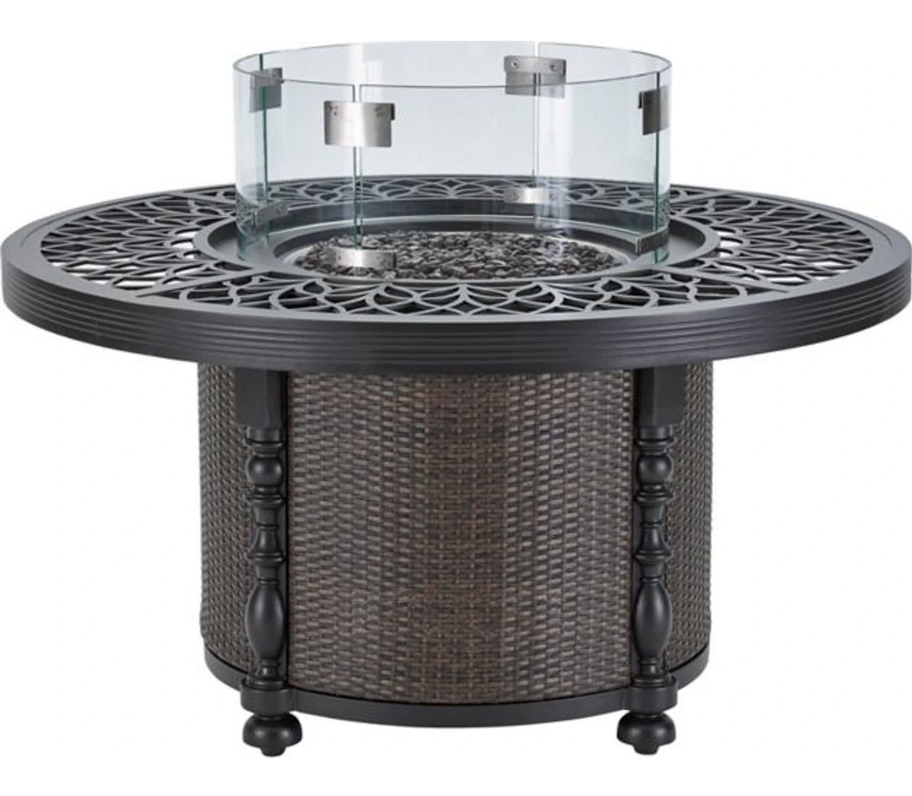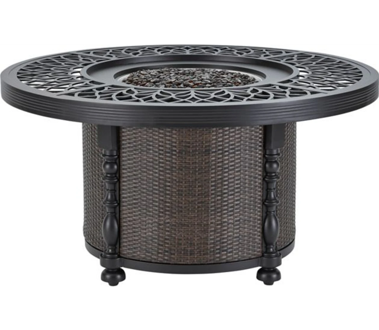 Hand-Woven polyethylene synthetic fiber woven over premium aluminum frame. Powder coated cast aluminum leg turnings and wide paddle arms. Accent items and tables feature cast aluminum. Available only in finish 640 Black Truffle.