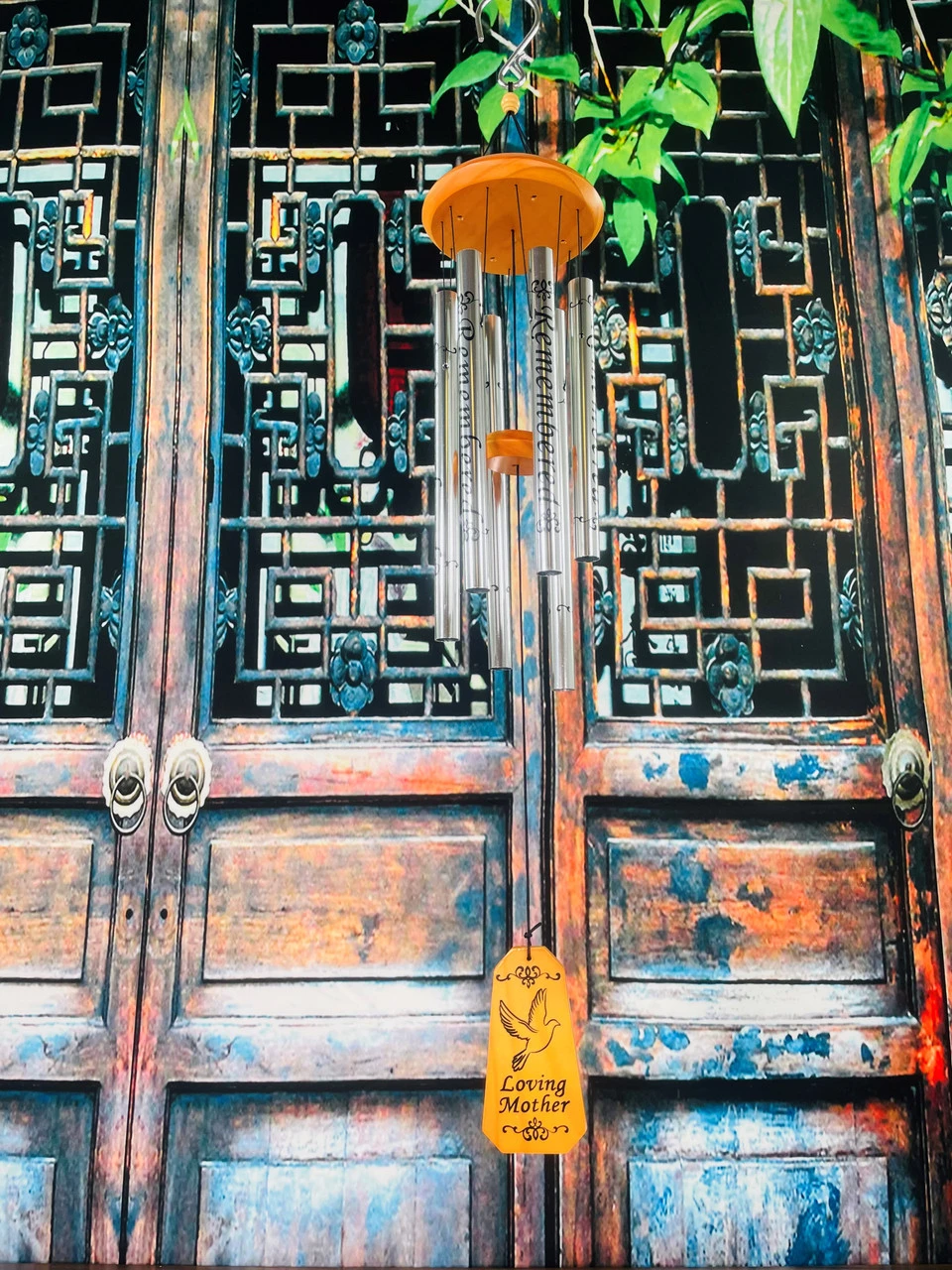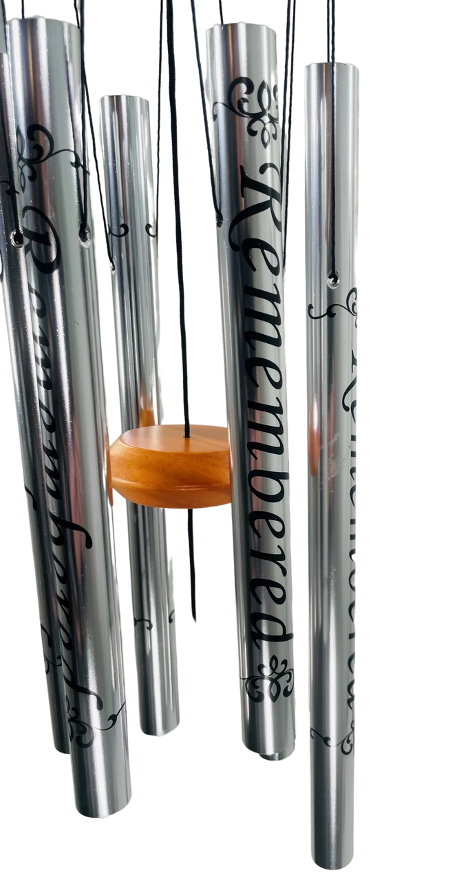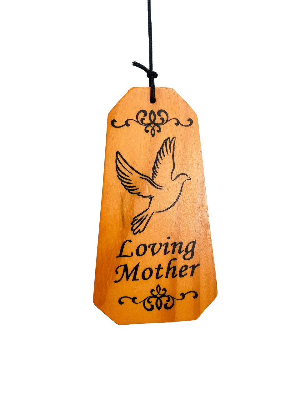 A lovely gift for the bereaved, this beautiful silver and natural wood chime set is decorated with a dove and Loving Mother on the wind catcher and Remembered in decorative script down each tube.