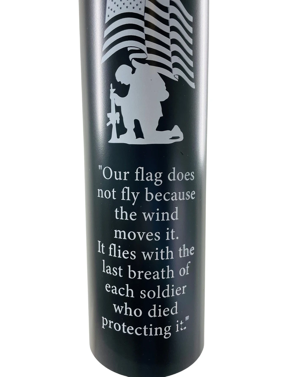 This beautiful Large single chime/wind bell is a testament of patriotism and sacrifice. The large steel chime is decorated in script with a kneeling soldier and verse. Finished in satin black with white script and has a lovely deep tone.