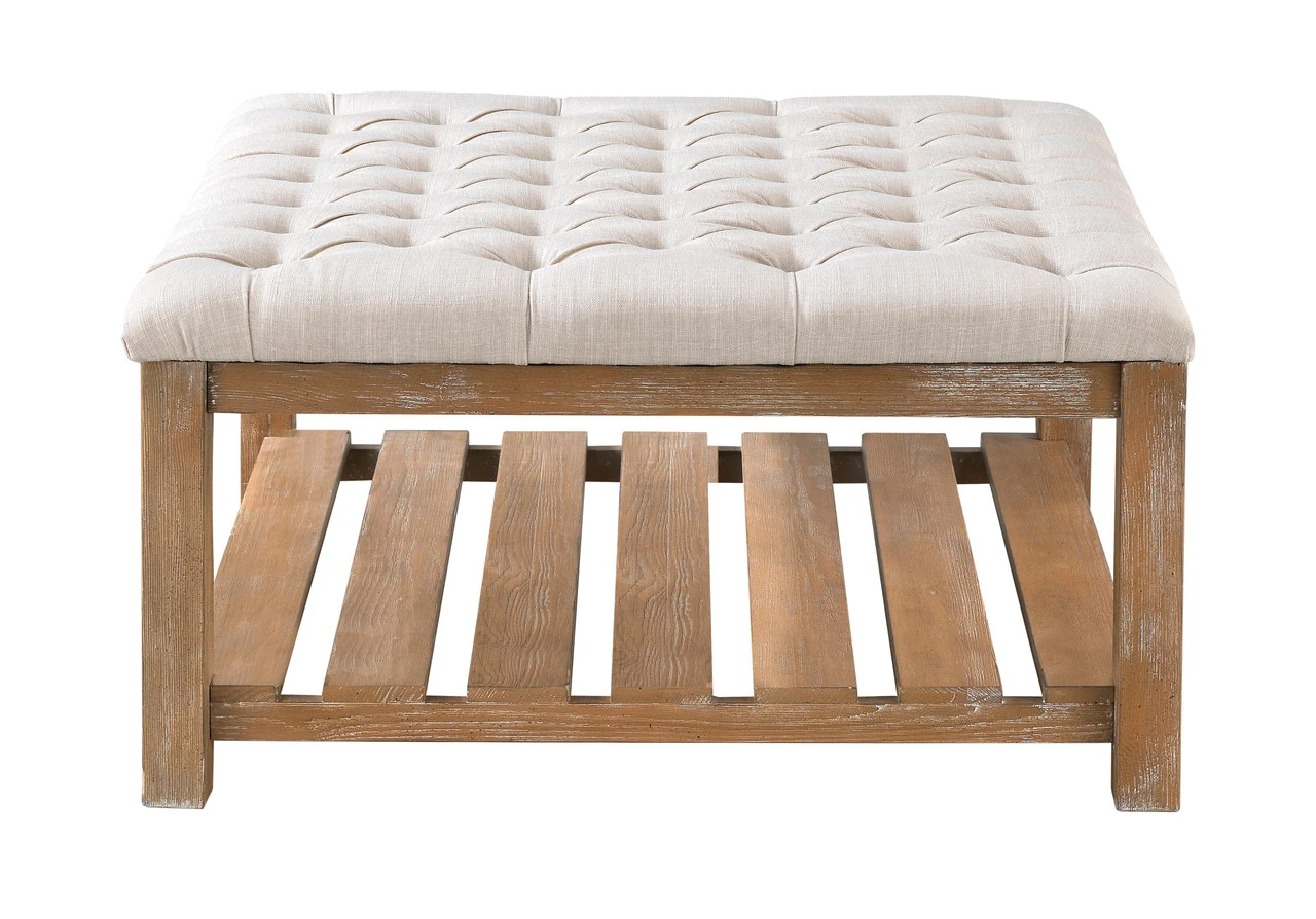 This square tufted ottoman has a natural distressed finish with limewash highlights blending well with the linen weave upholstery. The slat shelf below gives additional storage and display space keeping the overall look light and casual but extremely functional.